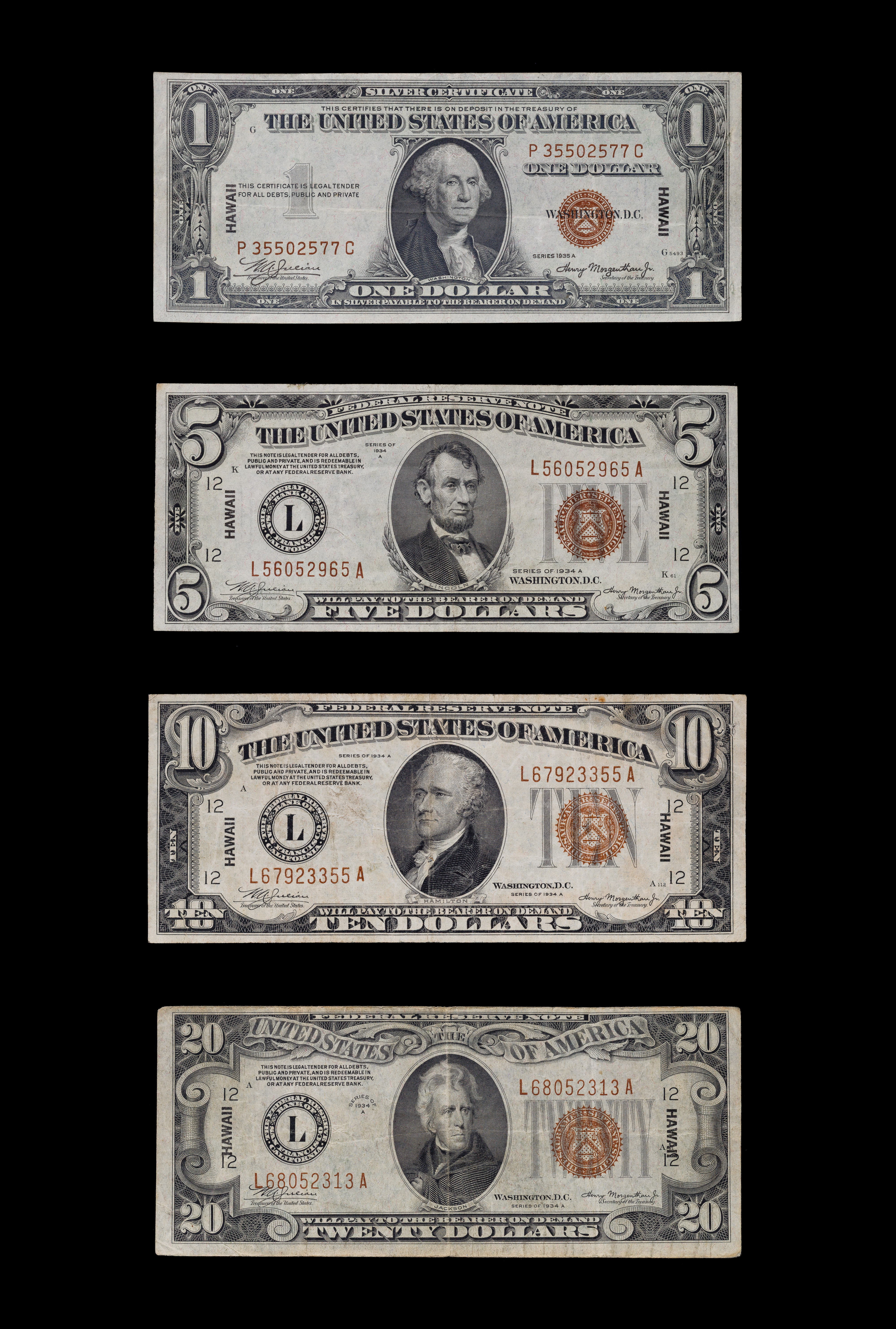 (4) items stamped 'Hawaii' having red seals including a 1935-A $1 P35502577C, a 1934-A $5 L56052965A, a 1934-A $10 L67923355A and a 1934-A $20 L68052313A