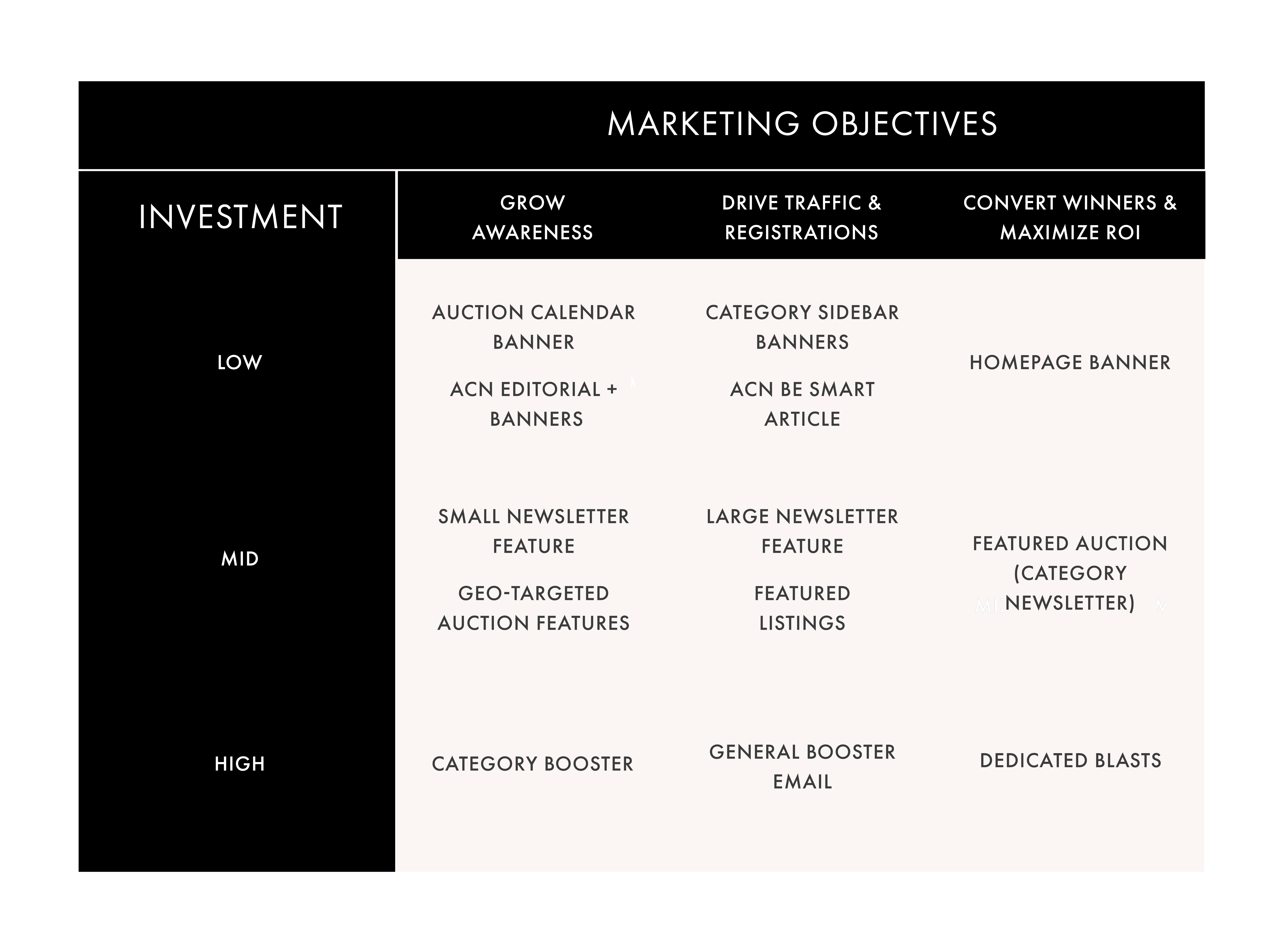 | Auction Calendar screens | Get your auction in front of high-intent bidders actively seeking upcoming auctions. | $1,000 |