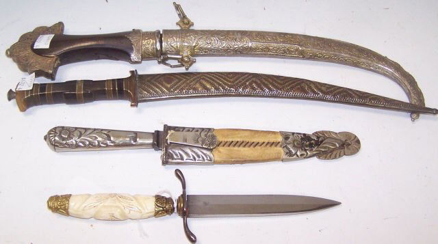 LOT 4 KNIVES WITH DECORATIVE HANDLESApr 28, 2026Collectible Knife Lot Inc. Kabar 1184, Edge Mark 55x & 1920's Olcut Slip Joint by Union2 days LeftLOT 4 KNIVES WITH DECORATIVE HANDLESApr 28, 2026Grouping of 4 Tribal Decorative Knives & DaggersApr 12, 20266 VARIOUS TOURIST KNIVES & FLAGPOLE TOP.Apr 19, 2026GROUP OF FOUR DECORATIVE ENGRAVED LETTER OPENERS6 days Left1 WWII GERMAN SA DAGGER & 2 DAGGER BLADES.Apr 17, 2026Ottoman Turkish Dagger With Coral10 hrs Left3 J. BEHRING HANDMADE KNIVES.Apr 18, 2026Grouping of 4 Fantasy Replica SwordsApr 12, 2026Antique Solid Sterling Silver Knives 4pc SETApr 16, 2026GROUP OF THREE LARGE REPRODUCTION CONFEDERATEApr 19, 2026Antique Moroccan Jambia Dagger (Looks To Be A Silver Sheath)10 hrs LeftIndo-Persian Crystal Dagger10 hrs LeftMorocco (Jambiya) Dagger And Sheath10 hrs LeftFIVE MILITARY BAYONETS AND DECORATIVE CEREMONIAL DAGGERS - .4 days Left