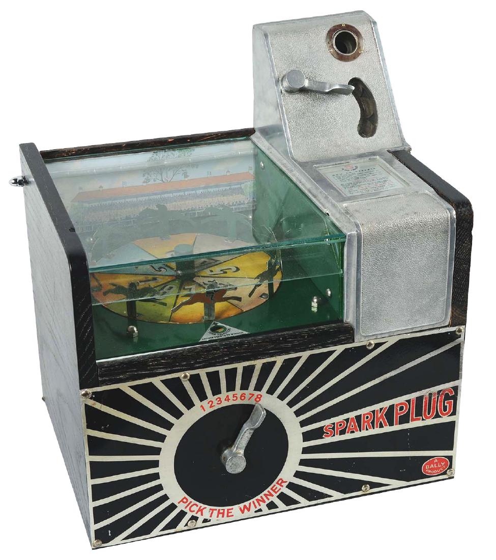 Sold**5¢ Bally Spark Plug Trade StimulatorThis countertop horse racing game was produced by Bally in 1934. It features a wheel divided into 8 sections, each with its own tin horse and rider figure. After depositing their coin, the player seleSee Sold Price