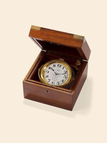 SoldWALTHAM WATCH Co. BOXED CHRONOMETERShip's eight day deck chronometer in a wood box with two hinged lids and brass banding h. 5 w. 4-7/8 d. 4-7/8 in. Provenance: Private collection, Pawling, NY [In Situ Item] This item will not be on diSee Sold Price