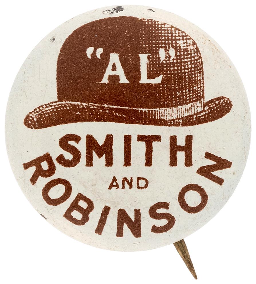 "'AL' SMITH AND ROBINSON” BROWN DERBY HAT LITHO BUTTON.
