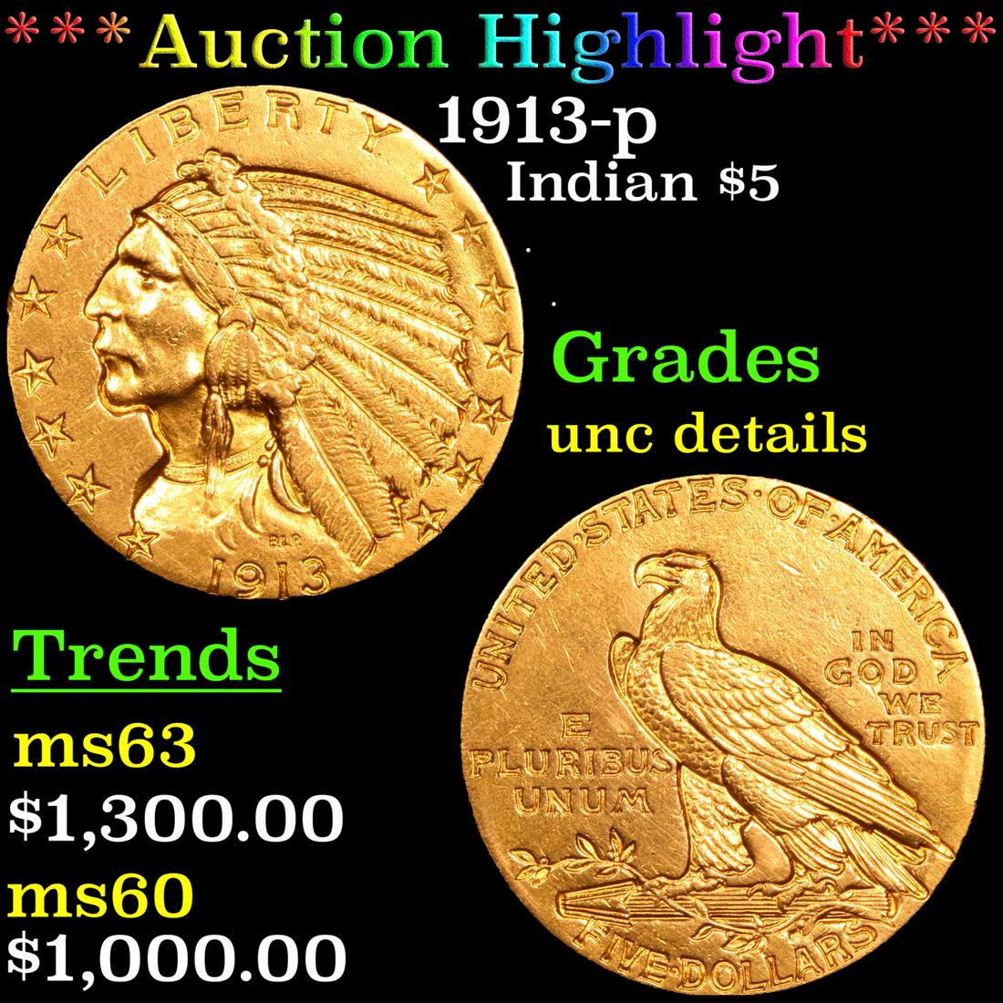 ***Auction Highlight*** 1913-p Gold Indian Half Eagle