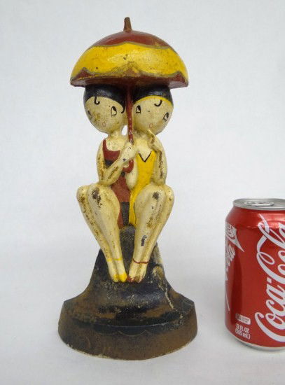 SoldBATHING BEAUTIES DOORSTOPHubley, "© FISH 250," extremely popular deco design, depicts two young ladies in bathing gear sharing a parasol, outstanding example.See Sold Price