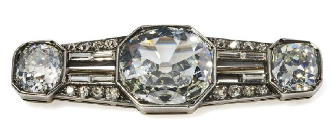 SoldSpilla barrette in platino, primi del Novecentoincisa e sbalzata, con tre diamanti centrali taglio vecchio e diamanti taglio rosa, cts. 4.00 totali circa. Cm. 9. Gr. 8 An early 20th Century platinum brooch with old cut diamonds and rose cut diamonSee Sold Price