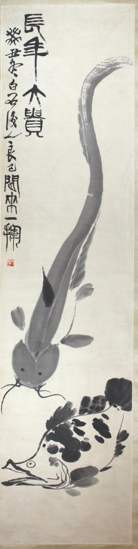 "Fish" Hanging Scroll Signed By Qi Liang Chi