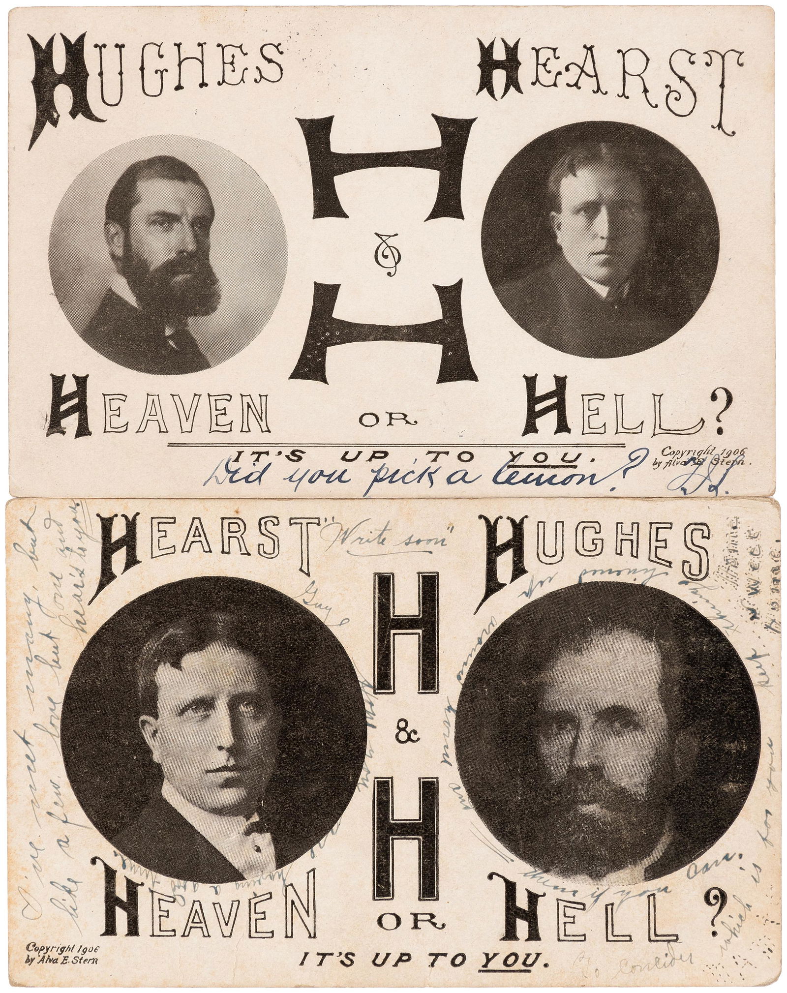 "HEARST AND HUGHES HEAVEN OR HELL?" POSTCARD PAIR.