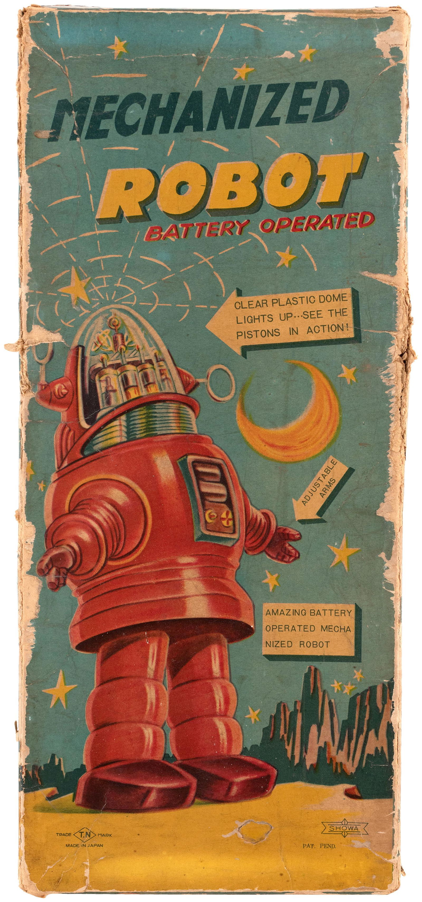 BOXED NOMURA PISTON ROBOT7 days LeftYONEZAWA TIN WINDUP SPACE EXPLORER ROBOTMar 14, 2026ASHITOY TIN FRICTION SPACE ROBOT PATROL w/ BOXMar 14, 2026MASUDAYA BATTERY OP SONIC "TRAIN" ROBOTMar 14, 2026YONEZAWA BATTERY OP JUPITER ROBOT w/ BOXMar 14, 2026BOXED JAPANESE MECHANICAL ROBOT7 days LeftALPS BATTERY OPERATED DOOR ROBOT w/ BOXMar 14, 2026NOMURA BATTERY OP ROBOTANK-Z w/ BOXMar 14, 2026YOSHIYA TIN WINDUP ATOM ROBOTMar 14, 2026YONEZAWA BATTERY OP MIGHTY ROBOTMar 14, 2026YONEZAWA BATTERY OP MIGHTY ROBOT w/ BOXMar 14, 2026YONEZAWA TIN WINDUP ASTRO SCOUT ROBOTMar 14, 2026YONEZAWA BATTERY OP CRAGSTAN MR ATOMICMar 14, 2026BOXED MASUDAYA ROBBY THE TALKING ROBOT7 days LeftLINEMAR BATTERY OP SMOKING SPACEMANMar 14, 2026Yoshiya "High-Wheel Robot" With Original Box