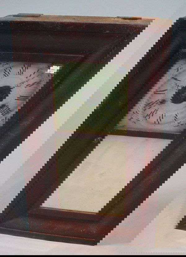 Seth Thomas Ogee shelf clock, which is an American mahogany veneer case clock from the mid-19th centSeth Thomas Ogee shelf clock, which is an American mahogany veneer case clock from the mid-19th century. The clock features a reverse-painted glass panel below the face, depicting a house by a body of