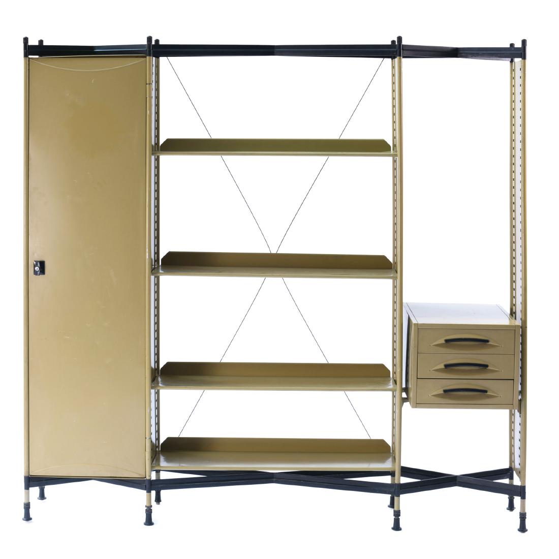 SoldGeorge Nelson & Associates CSSCSS (Comprehensive Shelving System), Herman Miller, USA, 1959. Enameled aluminum, walnut, laminate, aluminum, lacquered masonite. Wall unit consists of two bay, 3 shelves, 2 door cabinet (chrome plateSee Sold Price