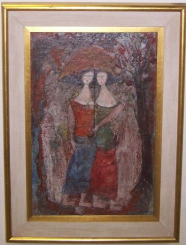 SoldLUCIANO SPAZZALI (ITALIAN, B. 1911) ABSTRACT PAINTINGLUCIANO SPAZZALI (ITALIAN, B. 1911) ABSTRACT PAINTING, mixed media, woman in red dress holding goat with feet in water, signed lower right. Housed in likely original frame. Third quarter 20th century.See Sold Price