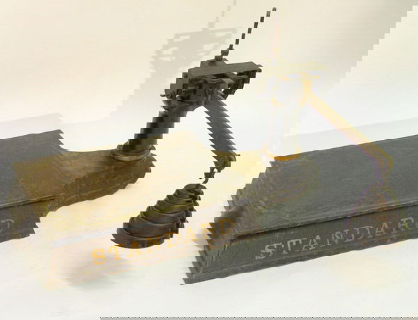 SoldENGLISH LIBRASCO BRASS BALANCE SCALES & WEIGHTSEnglish brass balance scales, Librasco, early 20th c., baluster-form standard, balance beam supporting two pans, on a wood base, accompanied by seven assorted weights, overall: approx 20"h, 18"w, 10"dSee Sold Price