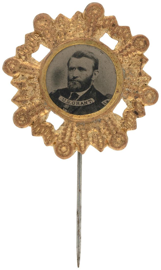 "US GRANT" FERROTYPE IN ORNATE BRASS SHELL BADGE.