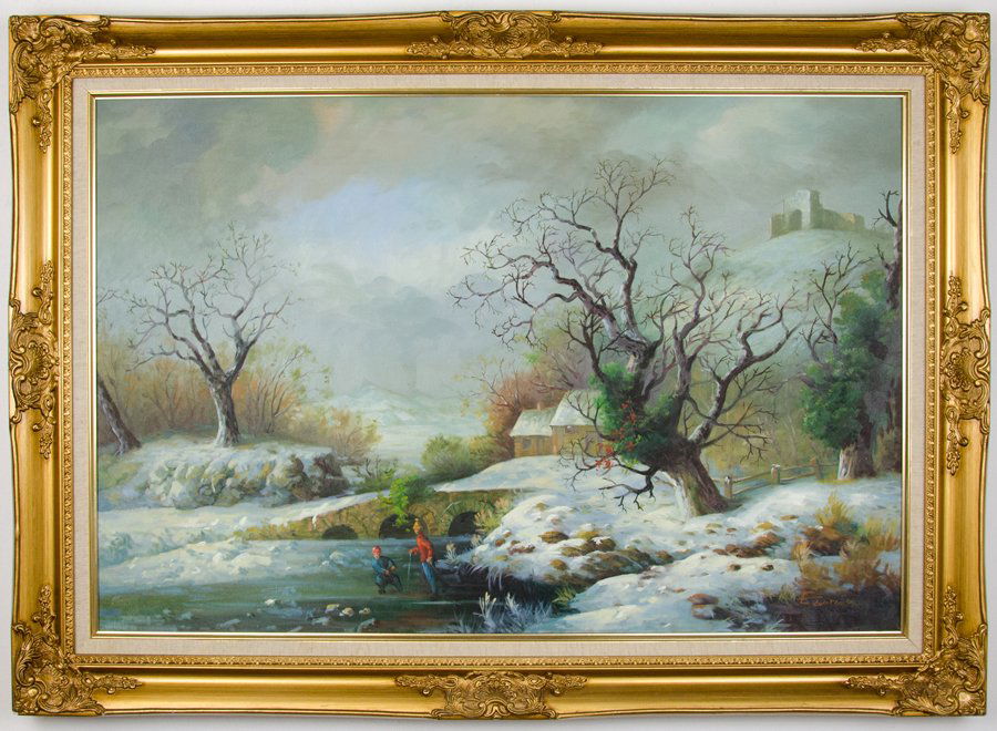 SoldPainting: 19th c. Winter LandscapePainting: 19th c. winter landscape with figures ice skating. Oil on canvas. 14 1/2" x 22 1/2", overall 21" x 29". Provenance: Ed and Anita Holden Collection.See Sold Price