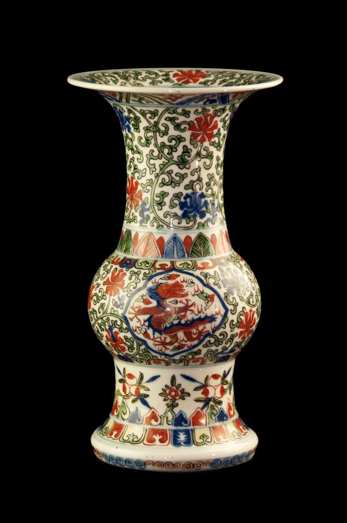 SoldMING WANLI WUCAI GU VASEDimensions: 12-1/2" H x 7-1/8" Dia. Finest, Chinese Ming Dynasty Period, Wanli Wucai porcelain GU vase. The vase potted in a Chinese porcelain traditional Gu shape. The beaker having baluster shaped bSee Sold Price