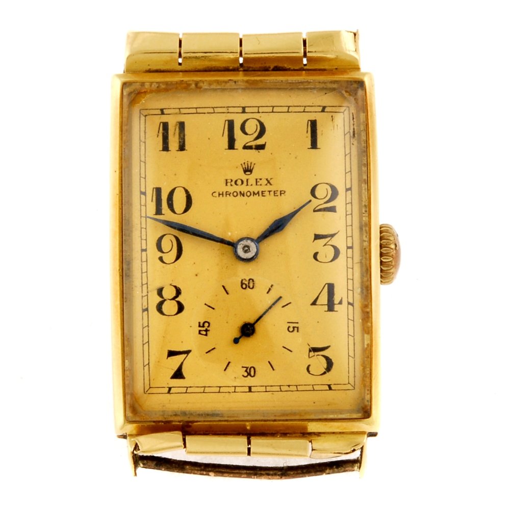 Sold18 K Gold Cellini Rolex Woman's WatchProperty from a Private Collection, Hilton Head Island, SC Description: 18 K Gold Cellini Rolex Woman's Watch , gold cushion shape face and brushed weave bracelet with fold over clasp, the back ofSee Sold Price