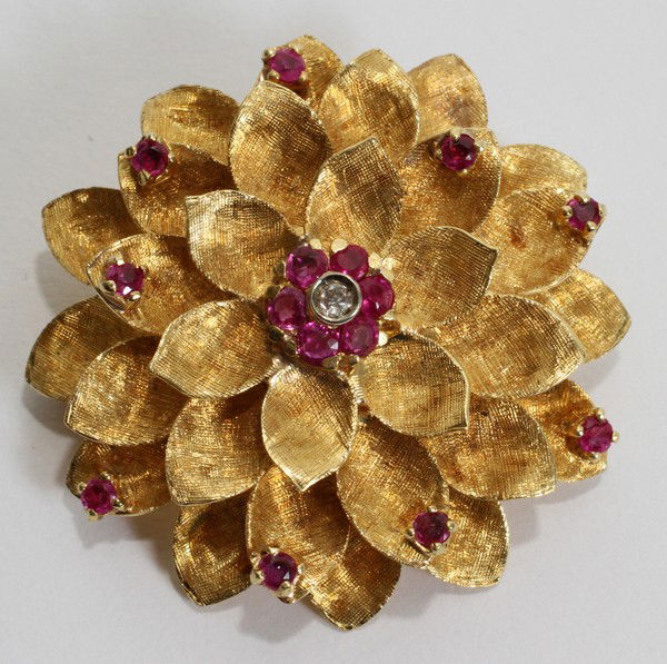 14K Gold Diamond & Ruby Burst Brooch