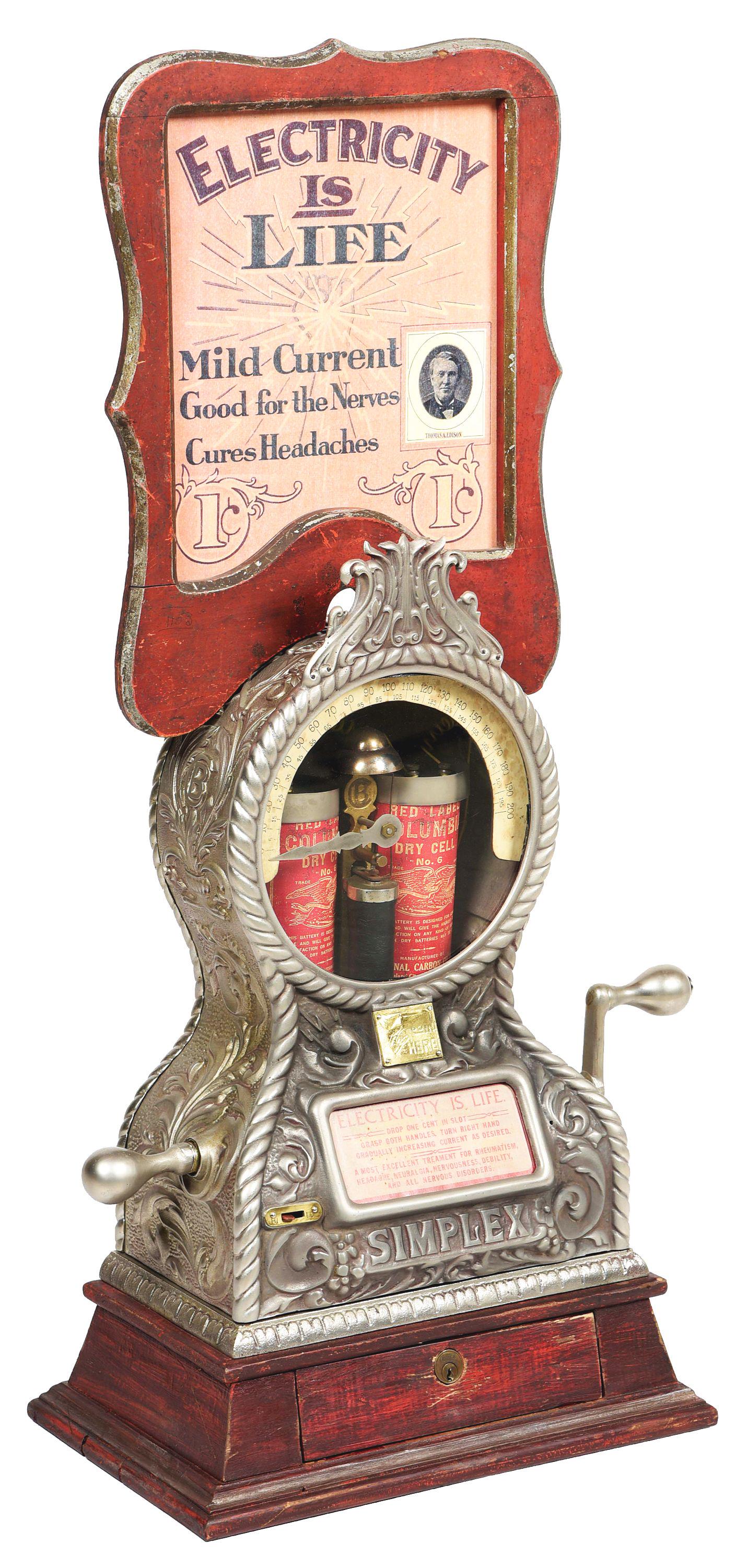 Sold1¢ ELECTRICITY IS LIFE ARCADE MACHINEBetween 1900 and 1909, Mills Novelty Co. created the Electricity Is Life shock machine in response to the interest in using electricity to "Treat All Forms Of Muscular Ills." Also referring to electriSee Sold Price