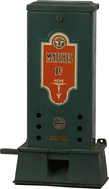 SoldColumbus 1 Cent Blue Tip Match Machine. Columbus: The Colum...Columbus 1 Cent Blue Tip Match Machine. Columbus: The Columbus Vending Co., ca. 1920s. Drop a penny into the vendor to release a match. Height 12”. Includes key, working. Rusting throughout.See Sold Price