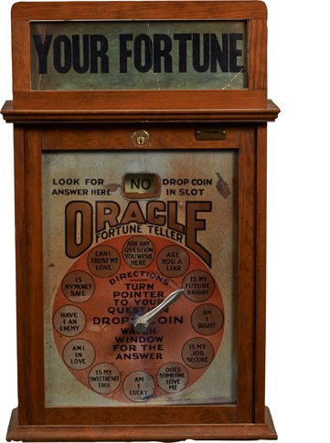 Sold1¢ Mills The Wizard Fortune Teller MachineFortune telling arcade machine manufactured by Mills Novelty Co. in 1926. Cast metal front with image of a swami and hieroglyphics. There is a wheel for the user to select what kind of fortune is toldSee Sold Price