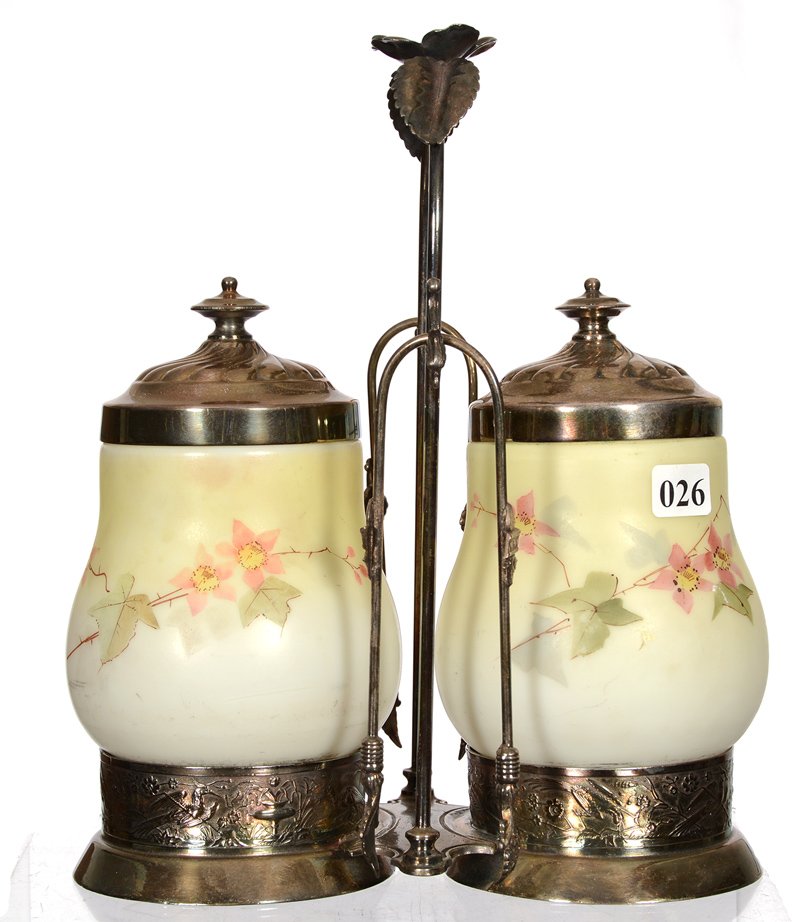 2 pc Lot Victorian Glass Pairpoint Mt. Washington Glass Biscuit Jars3 days LeftGroup of Three Antique Glass Oil LampsMar 15, 2026Pair of Antique English Porcelain Floral Vases – c.1860Rare Victorian Double Vaseline Uranium Glass Silverplate Pickle Castor3 days LeftForbes Silverplate Victorian Cranberry Enameled Double Pickle Castor3 days LeftPR OF CUT CRYSTAL FRENCH EMPIRE STYLE URN LAMPS 49" X 9" OVERALLMar 15, 2026(2) FLORAL BASE PEDESTAL KEROSENE LIGHTS260 Lots AwayAPAIR OF RETICULATED FLOWER ENCRUSTED MEISSEN VASES3 days LeftMonumental Pair of French Gilt-Bronze Mtd. Cut-Crystal VasesMar 12, 2026Chinoiserie Famille Rose Vases Mounted Lamps, PairApr 07, 2026Art Nouveau tableware set around 1900,Mar 14, 2026Italian Rococo Style Capodimonte Porcelain Table Lamps (2)Mar 07, 2026Mercury Glass Table Lamps, PairMar 26, 2026Meriden Silverplate Victorian Coralene Pickle Castor3 days LeftPair of Dresden Porcelain and Gilt Metal Figural Lamps3 days LeftTwo Milk Glass Lamps6 days Left
