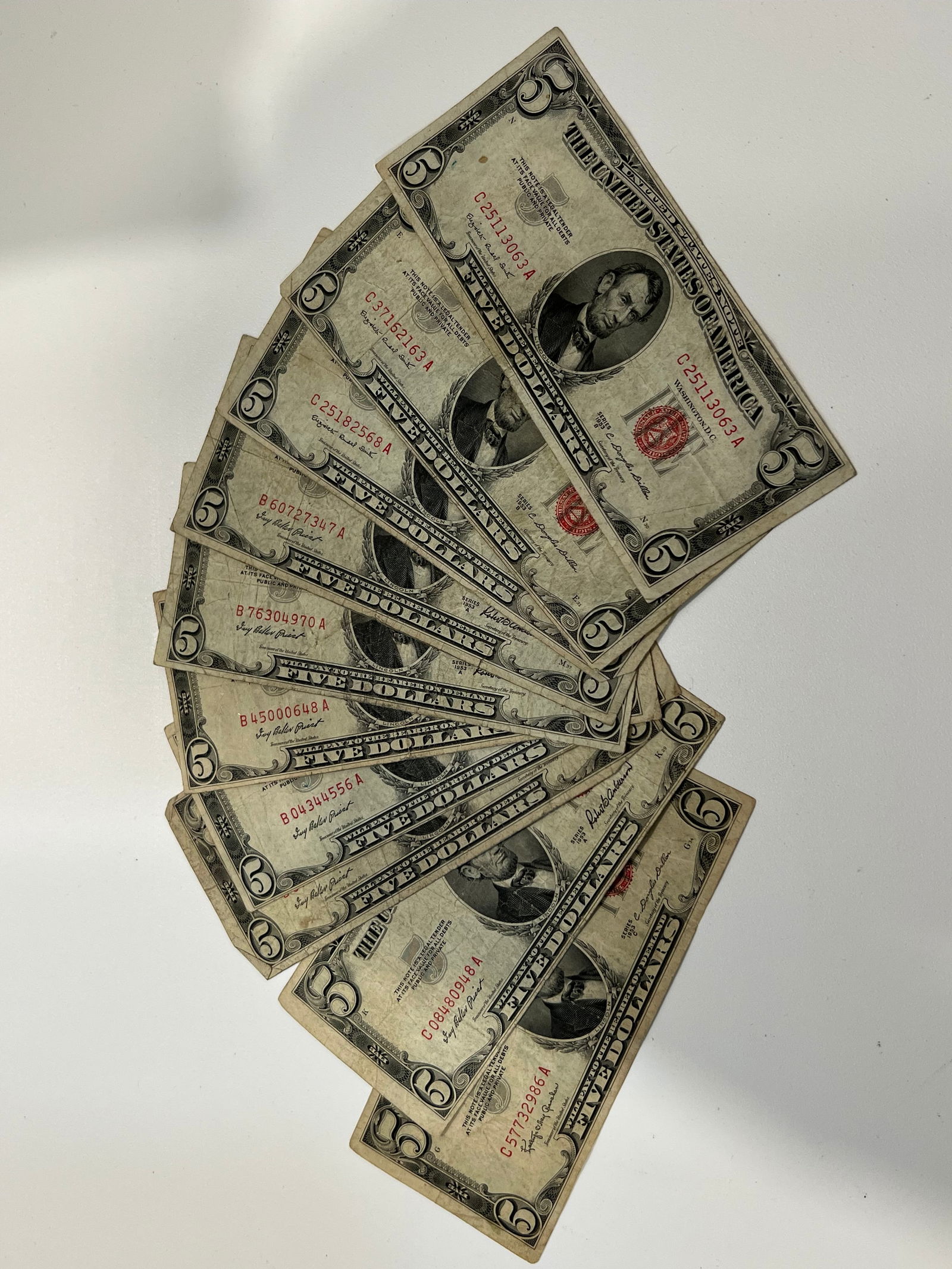 SoldUS 10 & 5 Dollar Note. 10 dollar green seal 1934A, (4) 5 dollar 1953 3 are red seal. (2) 5 dollarUS 10 & 5 Dollar Note. 10 dollar green seal 1934A, (4) 5 dollar 1953 3 are red seal. (2) 5 dollar red seal 1963See Sold Price