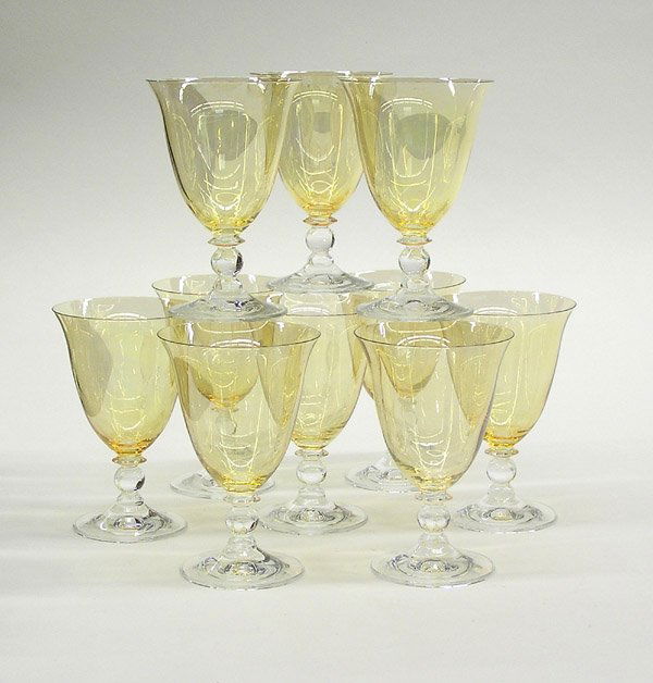 Sold10 AMBER CUT TO CLEAR HOCK GLASSESBohemian 20th c. Amber Cut to Clear Long Stem Hock Glasses. Each 8 1/2". Weight on all 9 pds 3 oz. PROVENANCE: A Charleston SC Private Estate.See Sold Price