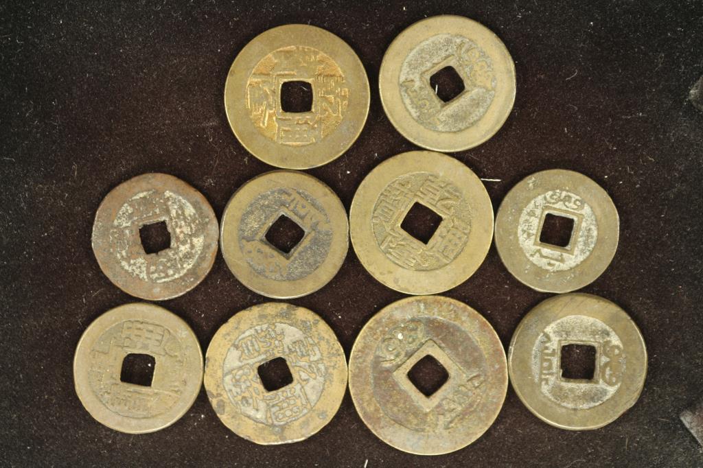 A set of Qing Dynasty copper gilt Five Emperors coins