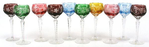 10 COLORED BOHEMIAN CUT GLASS GOBLETS