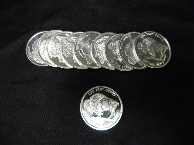 SoldFine Silver Coins 10 oz10 coins one troy ounce .999 fine silver. It was weighted and the total weight is 11 oz .Buffalo / India face "liberty"See Sold Price