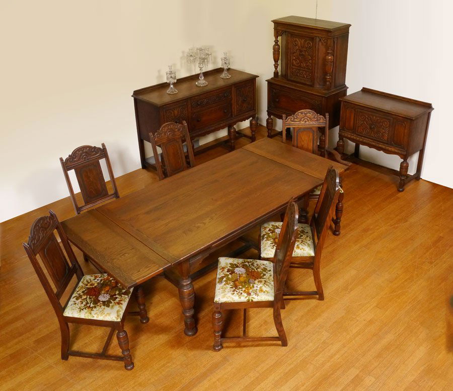 SoldAMERICAN CARVED OAK DINING SET, C 1900 TEN PIECESAMERICAN CARVED OAK DINING SET, C 1900 TEN PIECES Set includes six side chairs and one arm chair. One circular table with claw feet (H 54", Dia. 30"), four table leaves. One mirror backed buffet withSee Sold Price