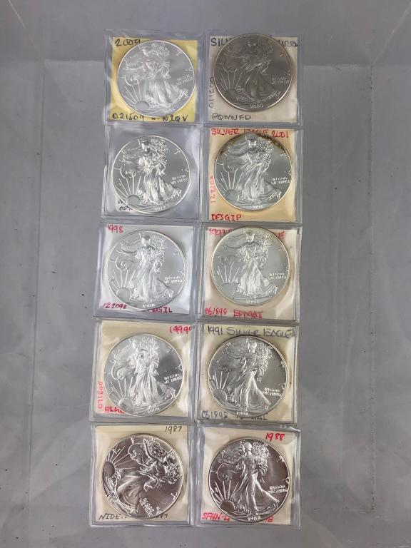 10 Silver Eagles Gem UNC Mixed Dates 1987-2014