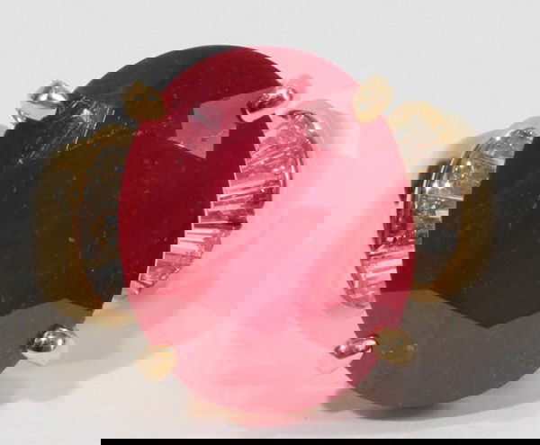 SoldGold ring with 7.16 ct natural ruby and diamondsGold ring with natural ruby and diamonds. Total weight: 3.94 g. Gold weight: 2.53 g. Gold - yellow color, hallmarked 585 (14k gold) Ring size: 16.5 mm. Face of the ring: 13.74 x 11.45 mm. Central stonSee Sold Price