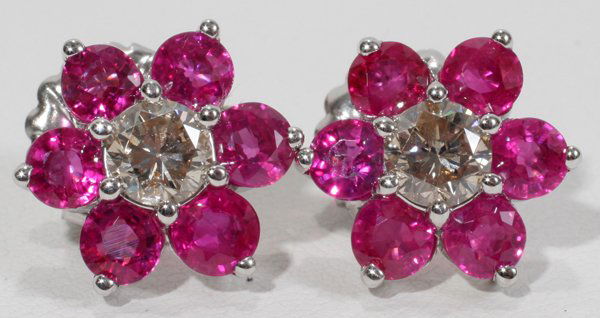 SoldPlatinum Diamond Ruby EarringsMETAL: Platinum. GEMSTONES: Diamonds approx. 0.60ctw. Rubies. MEASUREMENTS: Earrings are 13mm in diameter. TESTED: Platinum. WEIGHT: 5.6 grams.Gemstones have not been graded for color and clarity ,andSee Sold Price