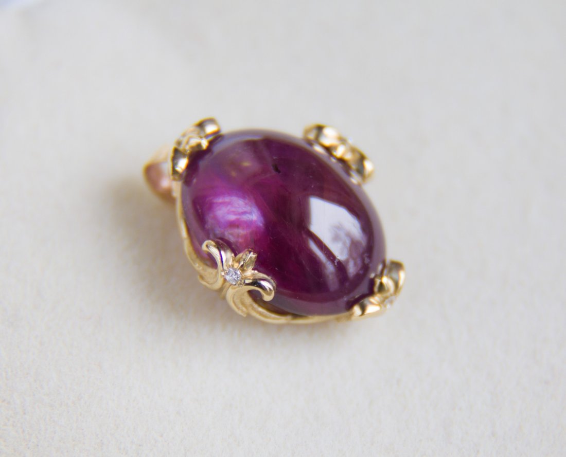 Sold8.19 ct. ruby gold pendant with natural diamondsGold pendant with natural ruby and diamonds Total weight: 2.32 g. Gold weight: 0.7 g.Gold - yellow color, hallmarked 585 (14k gold) Size: 15.28 x 12.35 mm. Central stone: Ruby Cut: Oval cabochon WeighSee Sold Price