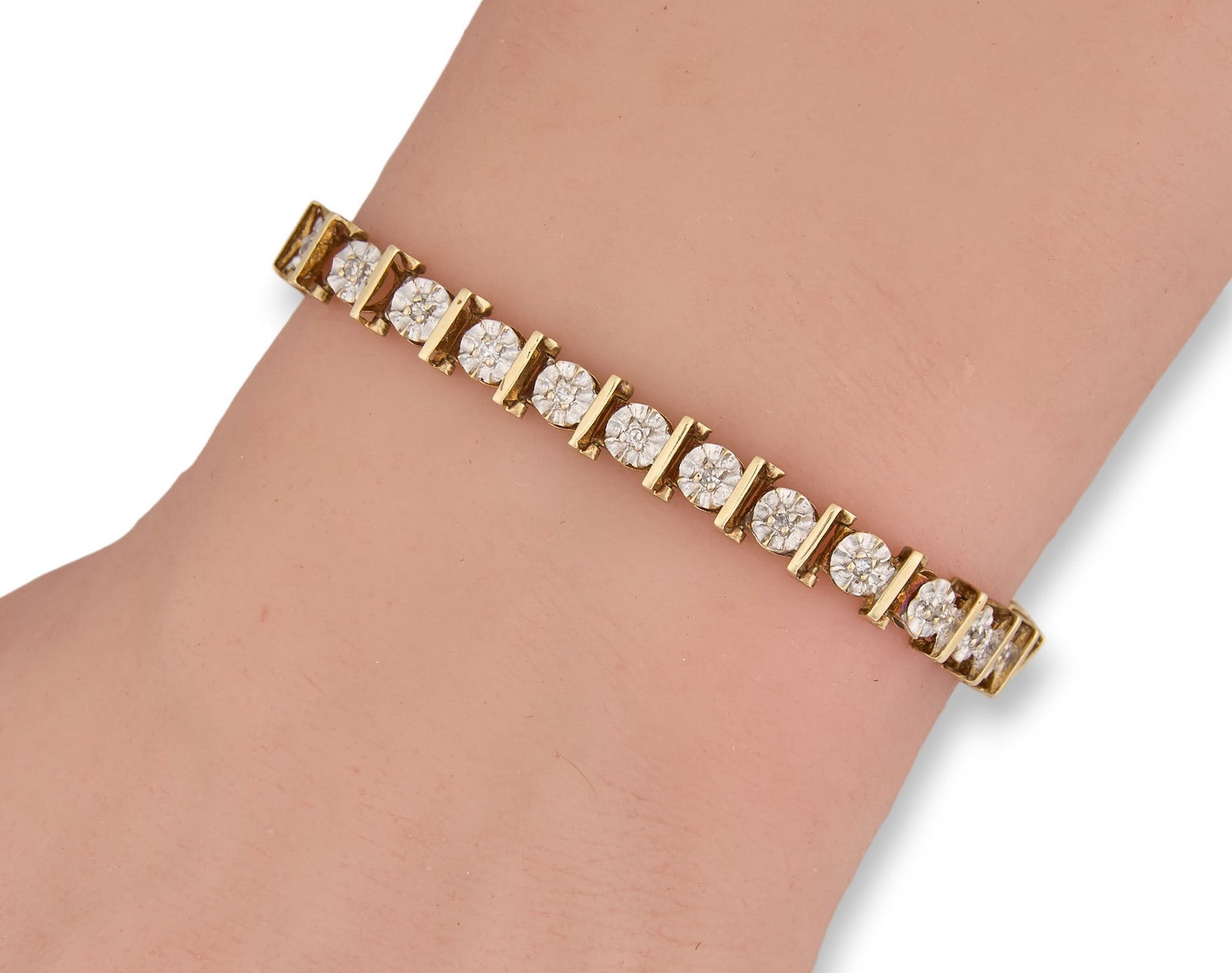 Sold10k Gold & Diamond Bracelet10k yellow gold bracelet with diamonds inset, marked 'M', '10k' to clasp Total weight: 8.95g Provenance: A San Antonio, Texas collection We happily provide seamless shipping serviceSee Sold Price
