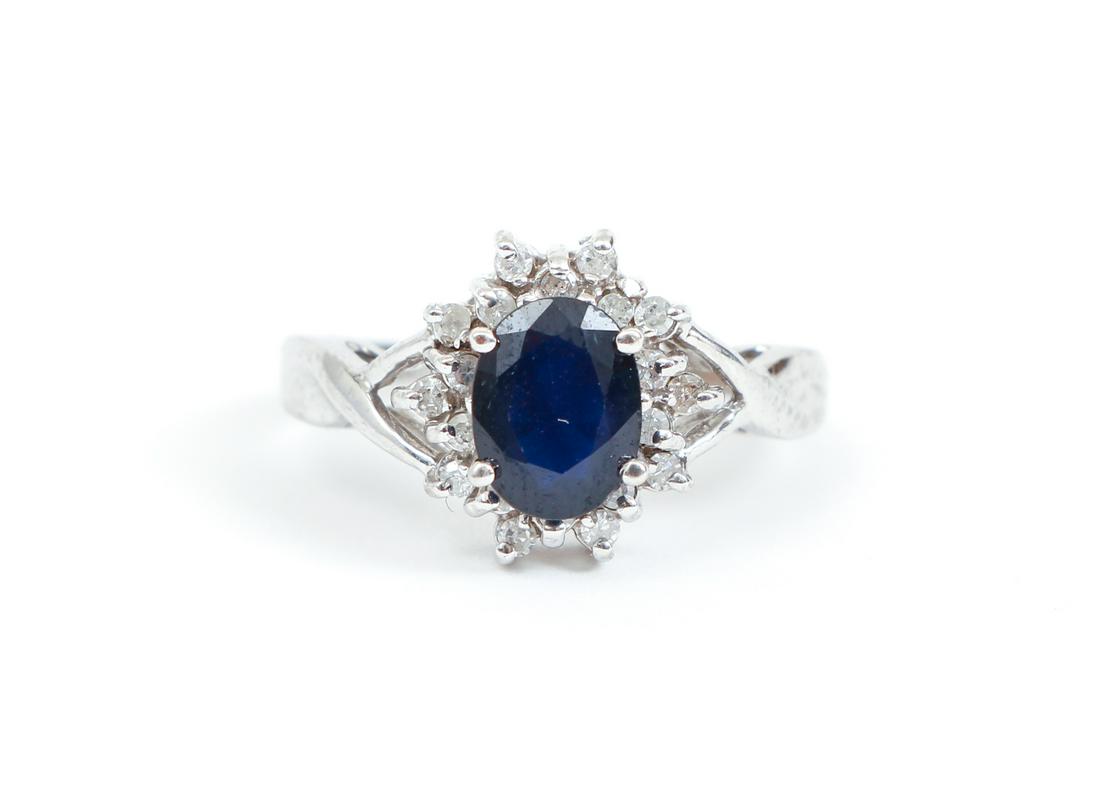 Sold10K Sapphire and Diamond Ring10K white gold sapphire and diamond ring. The ring is set with a .75 carat, oval cut sapphire and surrounded by fine faceted diamonds. The ring measures 12.5 mm in width, size 7. Marked 10K.See Sold Price