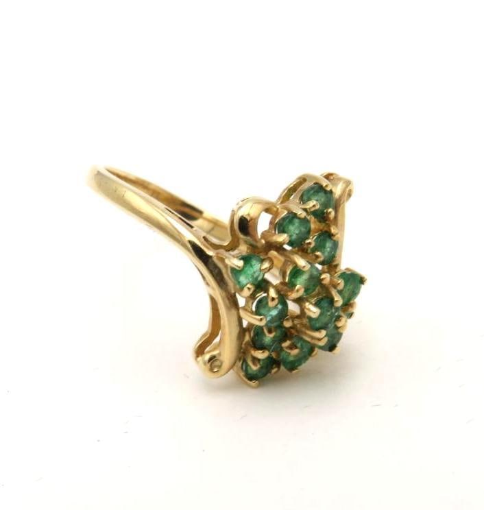 Womens 10K Yellow Gold Diamond Emerald Cluster RingFOR SALE IS A VINTAGE ESTATE 10K YELLOW GOLD CLUSTER RING WITH DIAMONDS AND EMERALD STONES. THE DIAMONDS ARE REAL BUT NOT SURE IF THE EMERALDS ARE REAL OR MANMADE. THE RING WEIGHS 3.6g. AND IS A SIZESee Sold Price