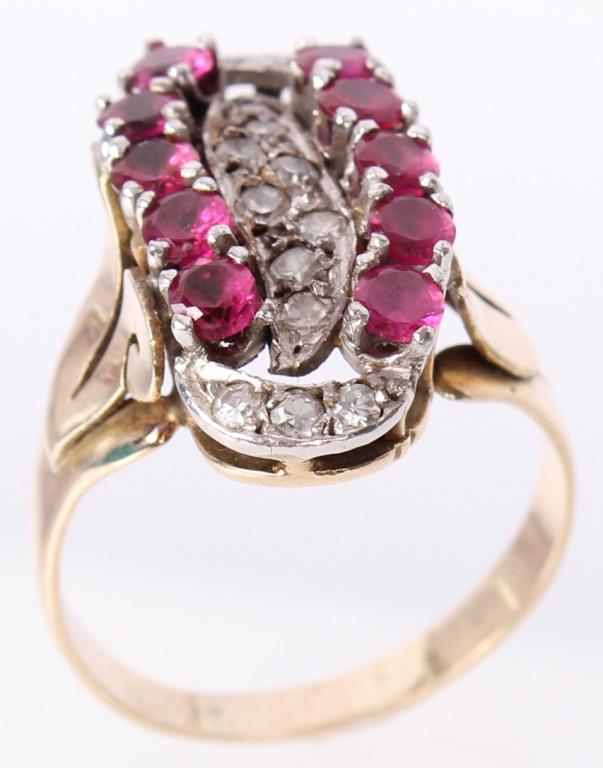 SoldTwo Ladies Vintage Diamond & Ruby RingsModern or Art Deco Style Yellow and Rose Gold, 10k. 2.4 dwt / 3.7 g. Size 6.5 good condition together with a 1940's 14k Rose Gold Buckle-Form ring with Diamonds and Synthetic Rubies. Size 4.5, Good CoSee Sold Price
