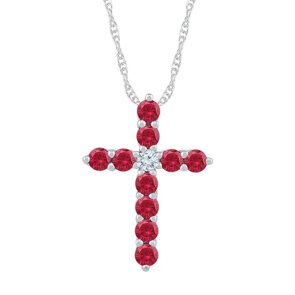 10kt White Gold Round Lab-Created Ruby Cross Pendant