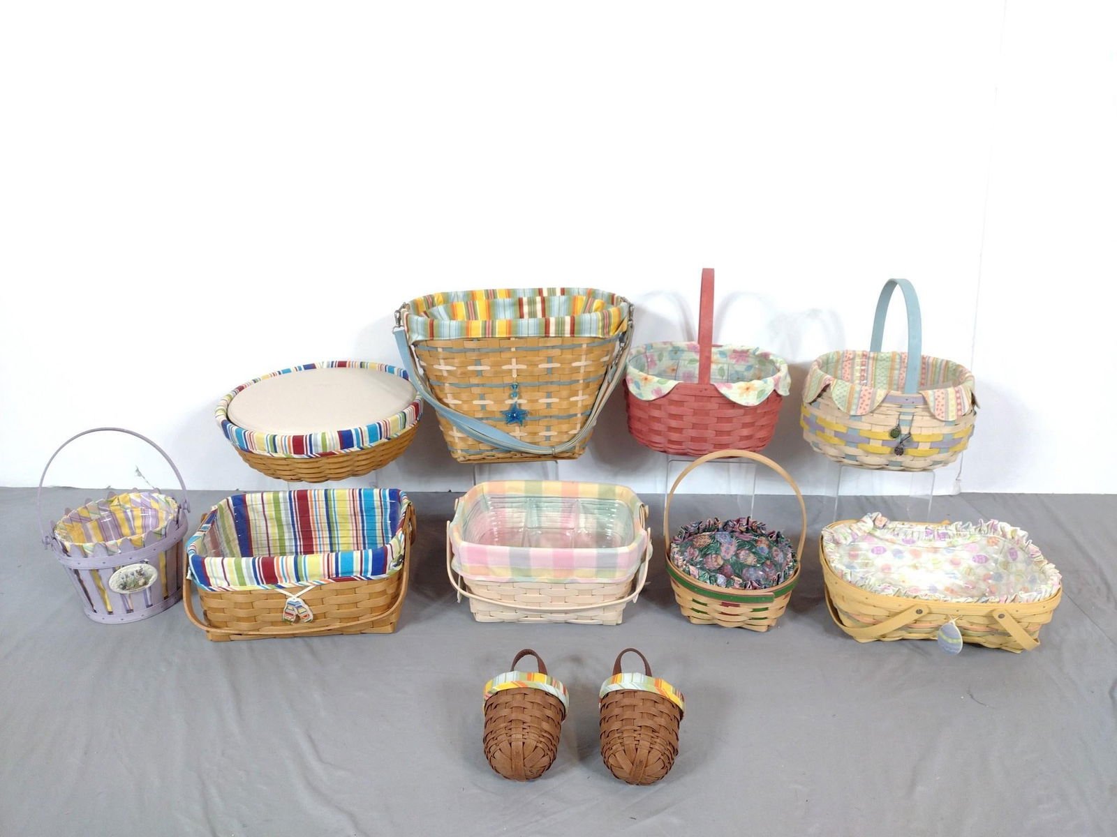 Sold11 Longaberger BasketsLargest 5" x 13" x 8". Some wear. Seven with plastic and/or fabric liners.See Sold Price