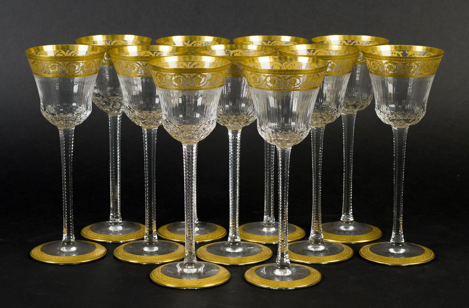 11 ST. LOUIS CRYSTAL THISTLE PATTERN SHERRY GLASSES.