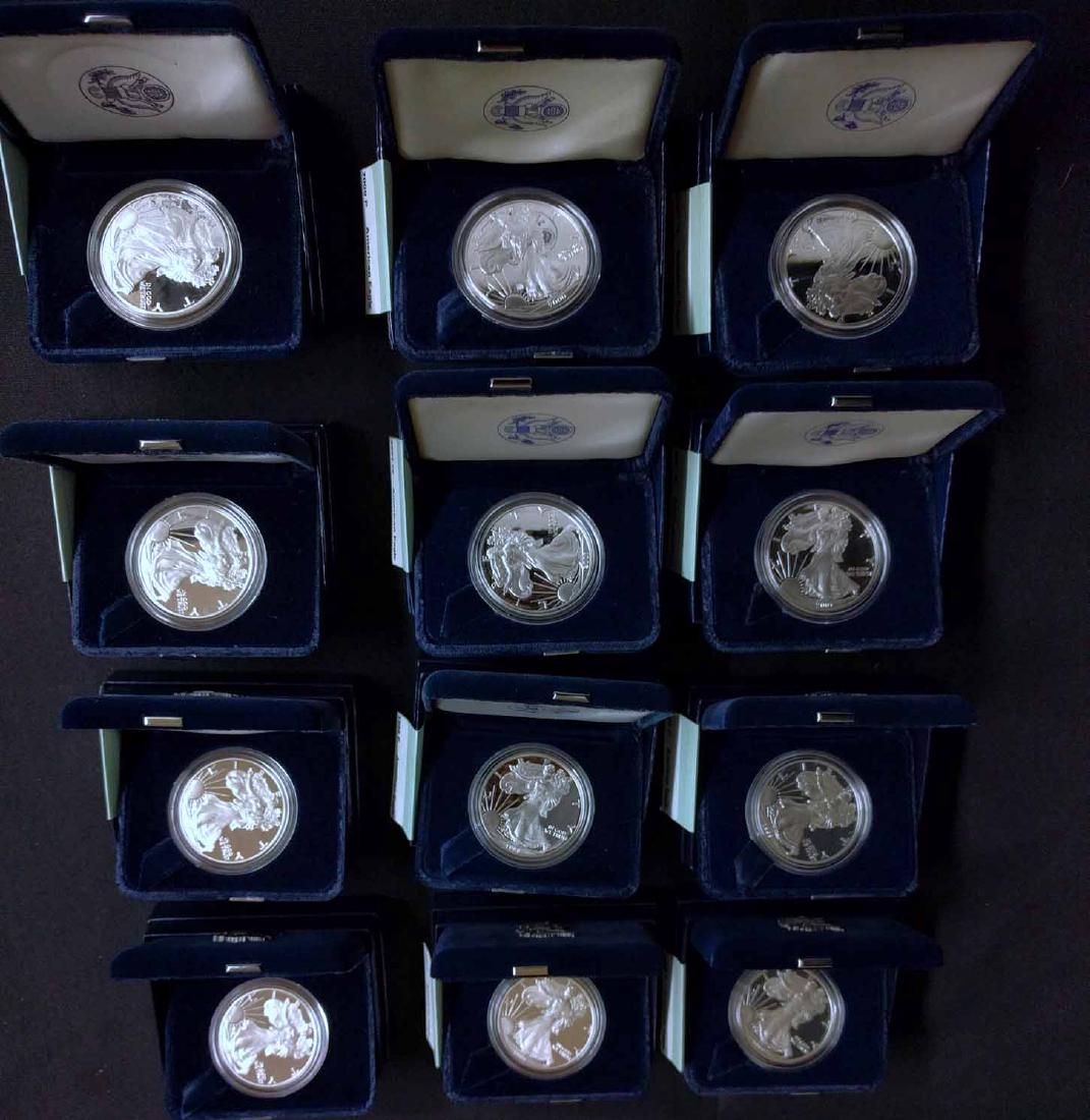 Sold(12) American Eagle Silver Proof CoinsIncluding: (2) 1997-P, (2) 1998-P, (3) 1999-P, (2) 2000-P, (3) 2001-W. (approx. 60% of the Grey Sheet).See Sold Price
