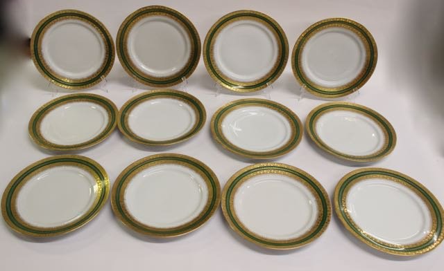 SoldF & B BARONET BOHEMIA DINNER PLATESSet of (12) Porcelain Plates by F & B Baronet, Czechoslovakia, floral decorated with gilding and green central band, 10 3/4" diam. Two plates have minor paint loss to green band, otherwise good conditSee Sold Price
