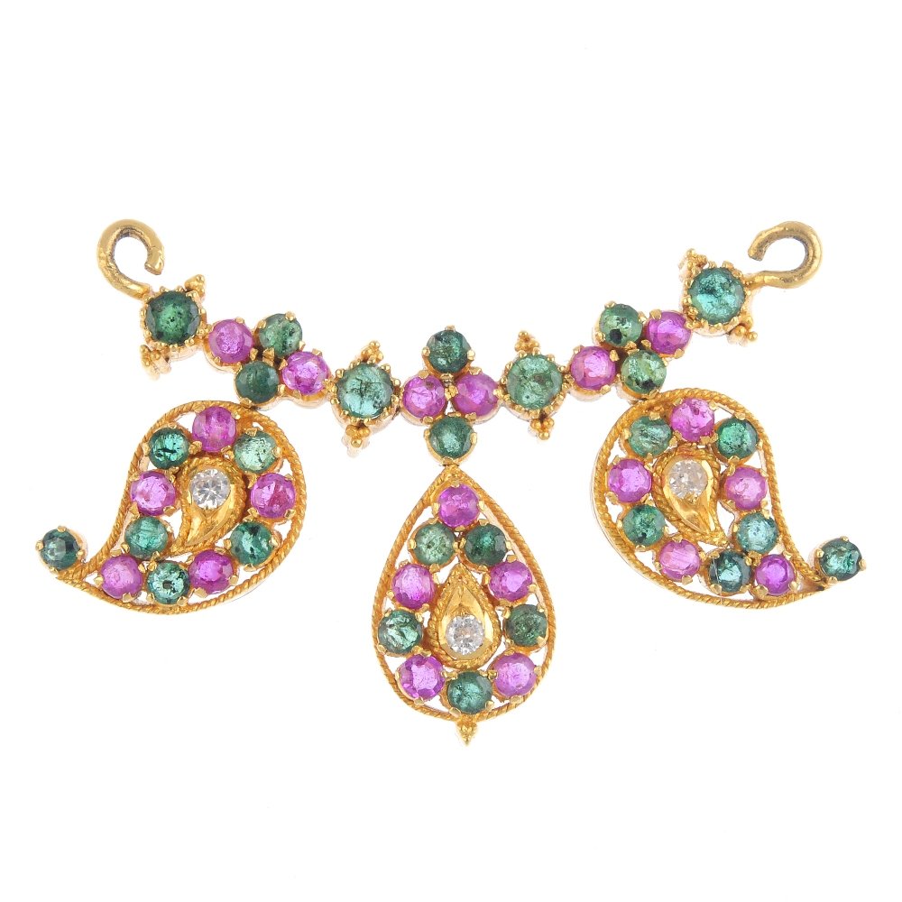SoldThree diamond and gem-set pendants. To include aThree diamond and gem-set pendants. To include a diamond and coloured diamond pendant, a kundan work diamond, seed pearl and blue gem-set enamel pendant, together with an early 20th century garnet-topSee Sold Price