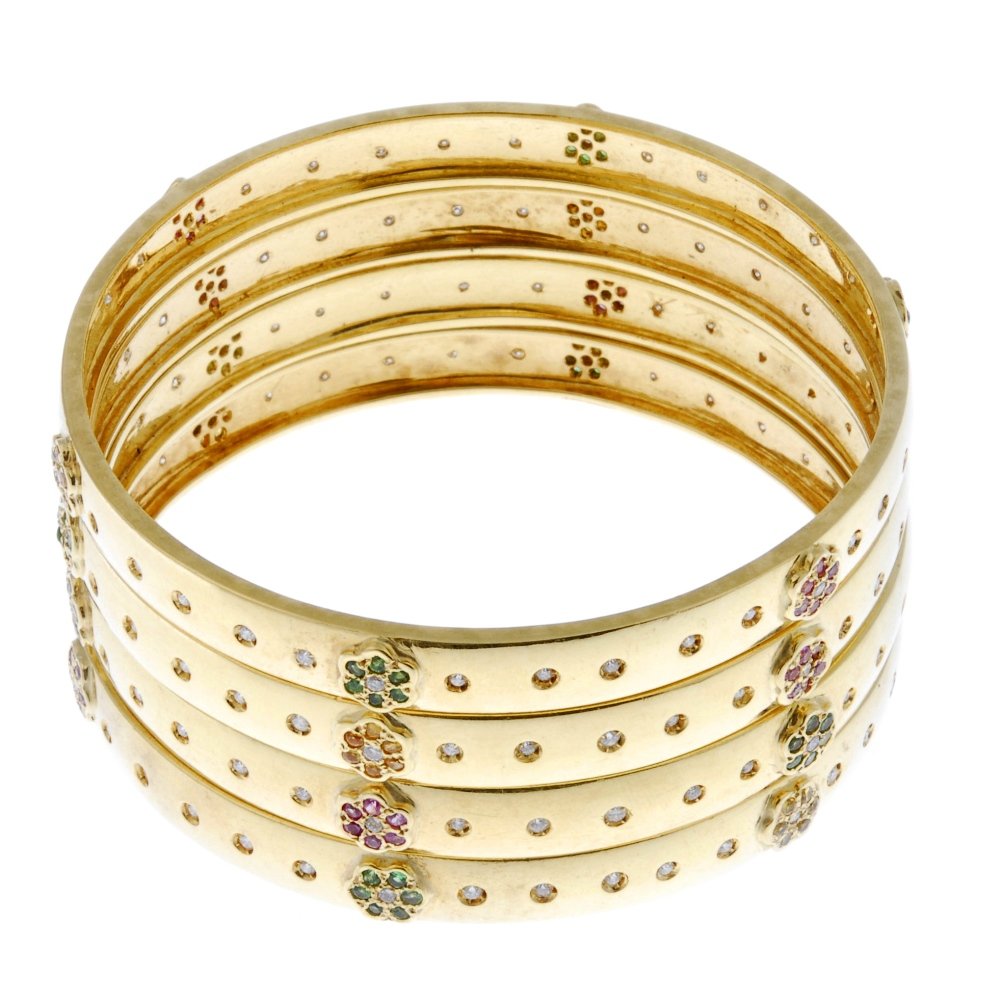 SoldA group of four gold banglesA group of four gold bangles two hinged bangles in fourteen karat gold with filigree pattern; two gem-set hinged bangles in ten karat gold. 47.1 Gross dwt.; Circumference: 7 in. to 8 1/2 in.See Sold Price