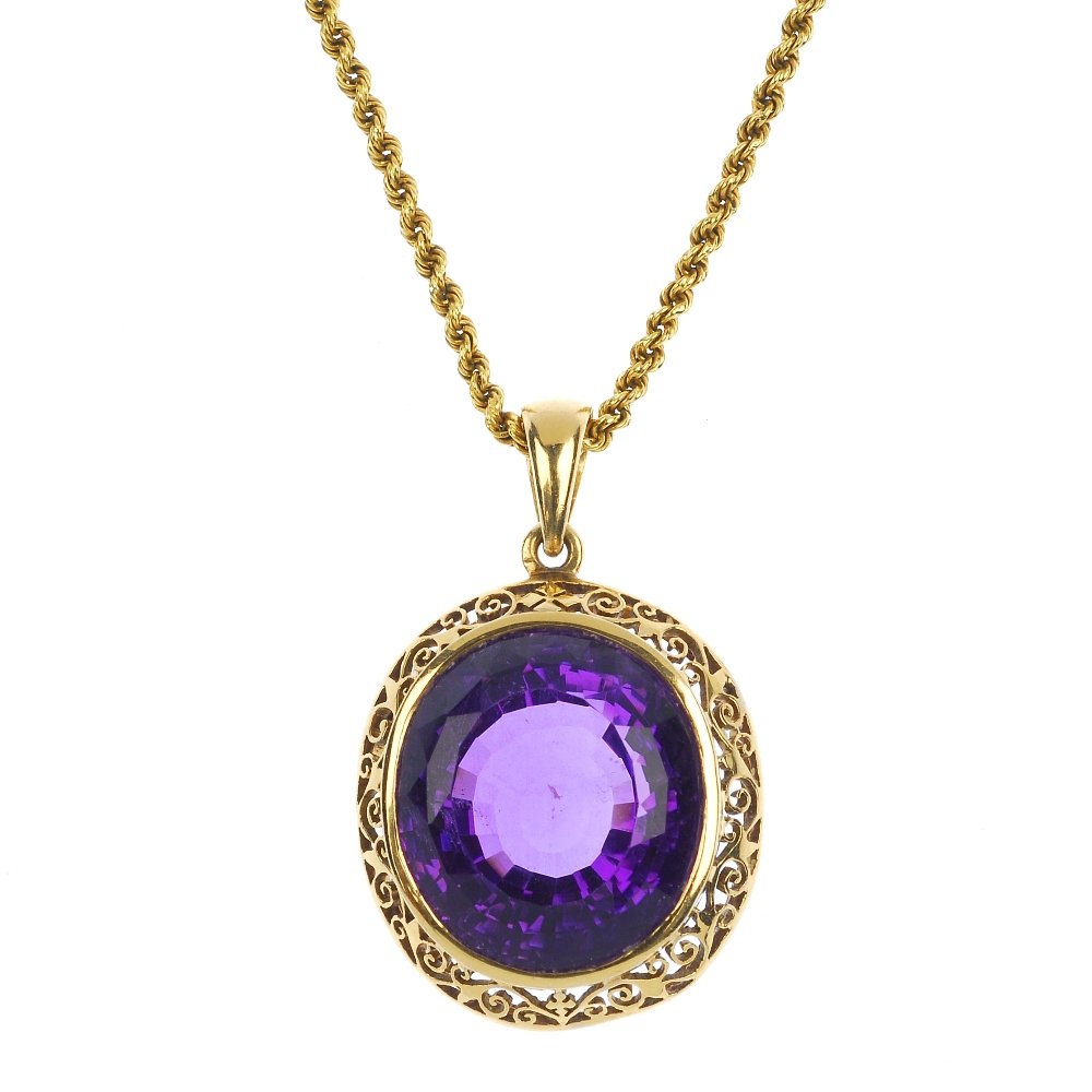 SoldAmethyst Pendant NecklaceMETAL: 18K yellow gold GEMSTONE(S): triangular faceted amethyst approx. 113.50 carats total MEASUREMENTS: 15-1/4 inches; 1-5/8 x 1-5/8 inches pendant WEIGHT: 42.90 g.Stamped: 750, SCSee Sold Price