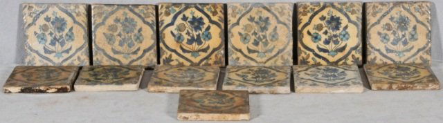 13 ANTIQUE PERSIAN TILES. MULTI -COLORED ENAMEL