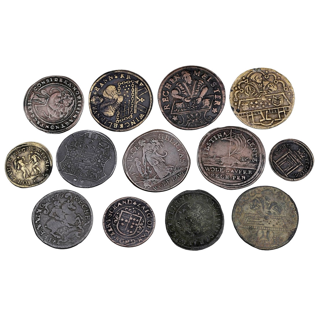 13 Embossed Copper Counter Tokens, c. 1650