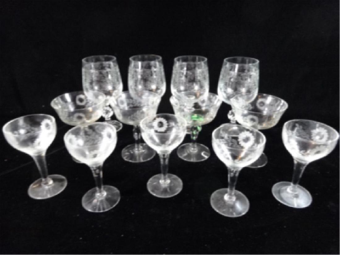 13 PC VINTAGE ETCHED CRYSTAL STEMWARE, 2 PATTERNS,